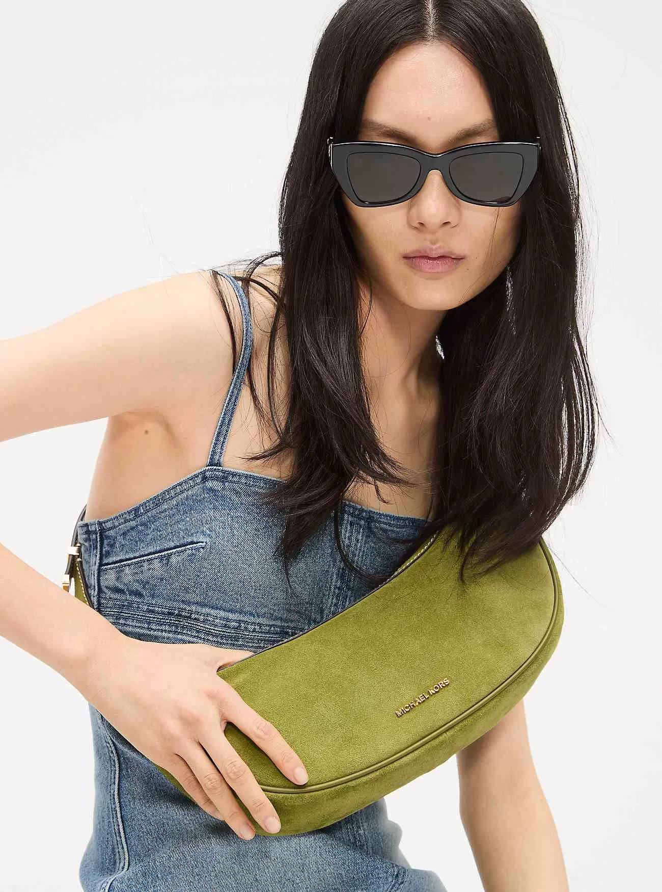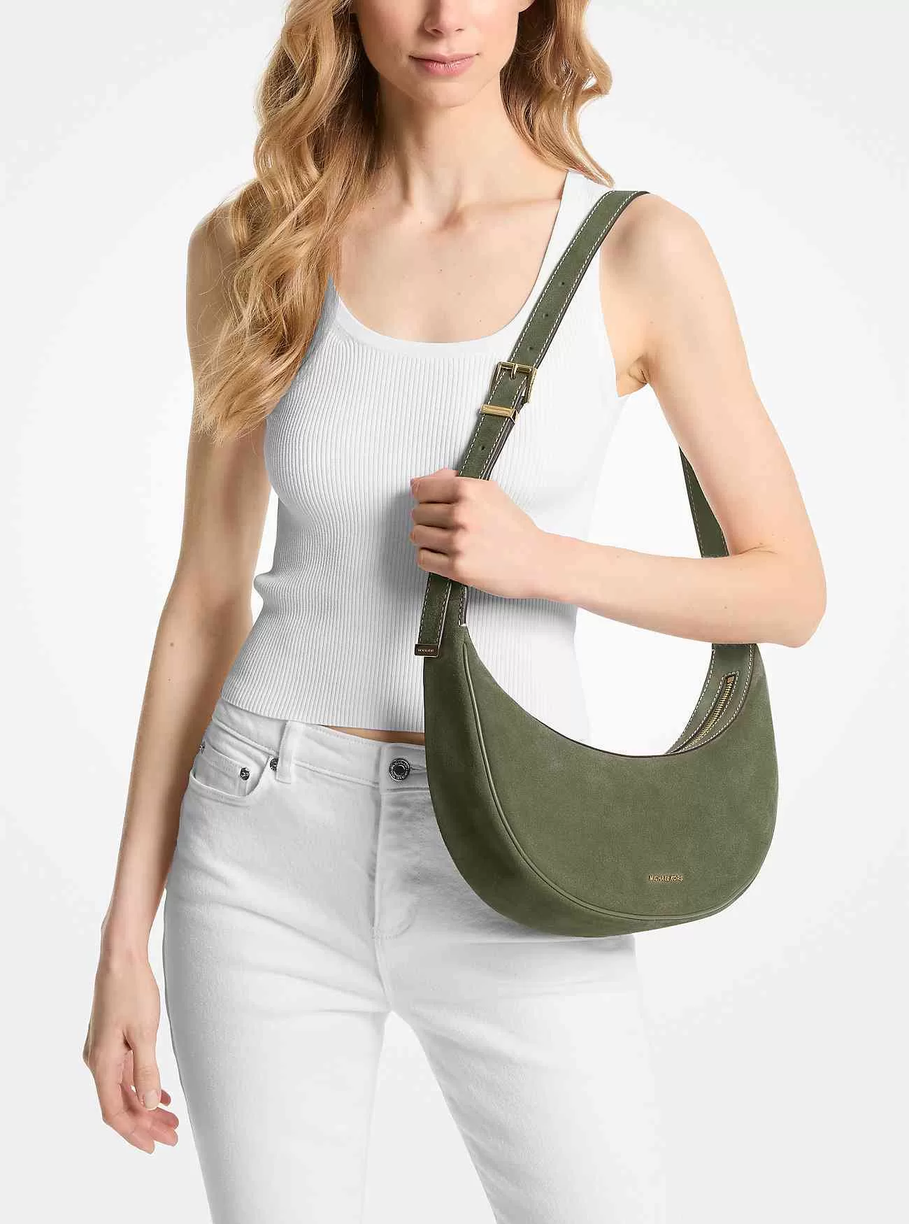 La nostra borsa Avra potrebbe essere il modo più chic per trasportare i tuoi oggetti essenziali quotidiani. È realizzato in sontuosa pelle scamosciata a forma di mezzaluna con un cinturino con fibbia che può essere regolato alla lunghezza desiderata. Il profilo sottile lo rende adatto a qualsiasi numero di occasioni.