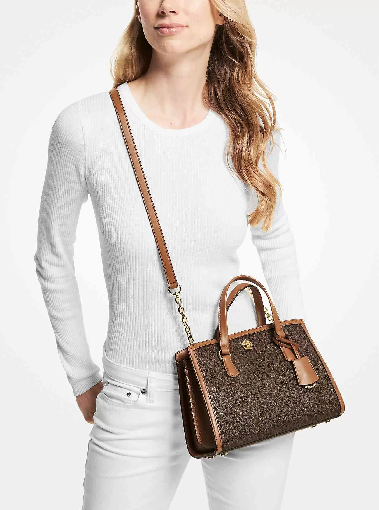 Con la sua silhouette strutturata e l’hardware glamour, la nostra borsa a tracolla Chantal con finiture in pelle è un must in ogni guardaroba sofisticato. È realizzato in tela con stampa Signature e presenta uno scomparto con cerniera che riporterà in sicurezza gli oggetti più piccoli. Trasportalo con i robusti manici superiori o tramite la tracolla a catena staccabile nelle giornate più impegnative.