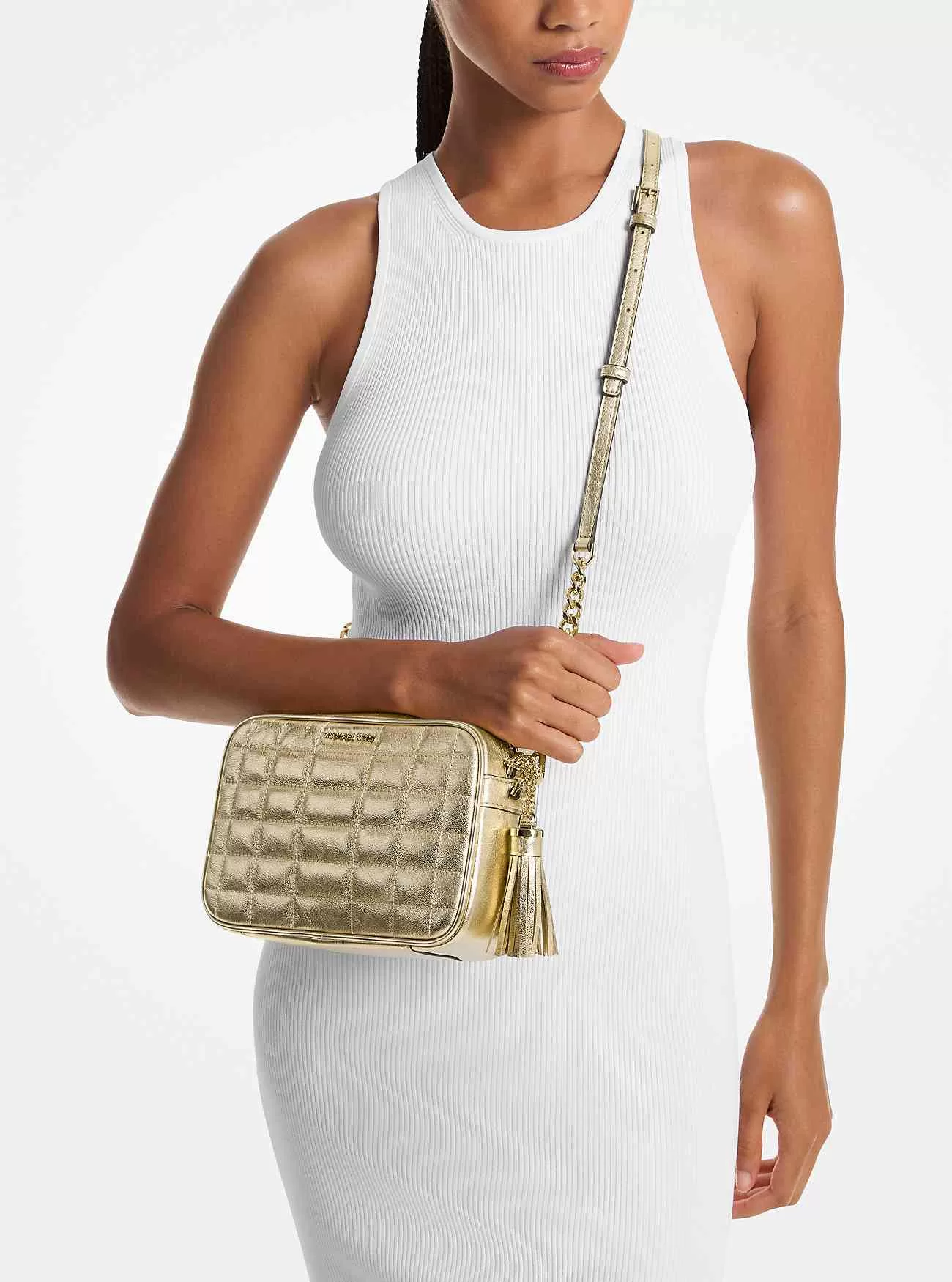 La borsa a tracolla Jet Set raggiunge il perfetto equilibrio tra sobrietà e lusso, con un design in pelle metallizzata leggermente strutturata che presenta una finitura trapuntata. Completo di dettagli a maglie di catena e una nappa oversize, questo preferito per tutti i giorni è un modo semplice per elevare qualsiasi outfit.