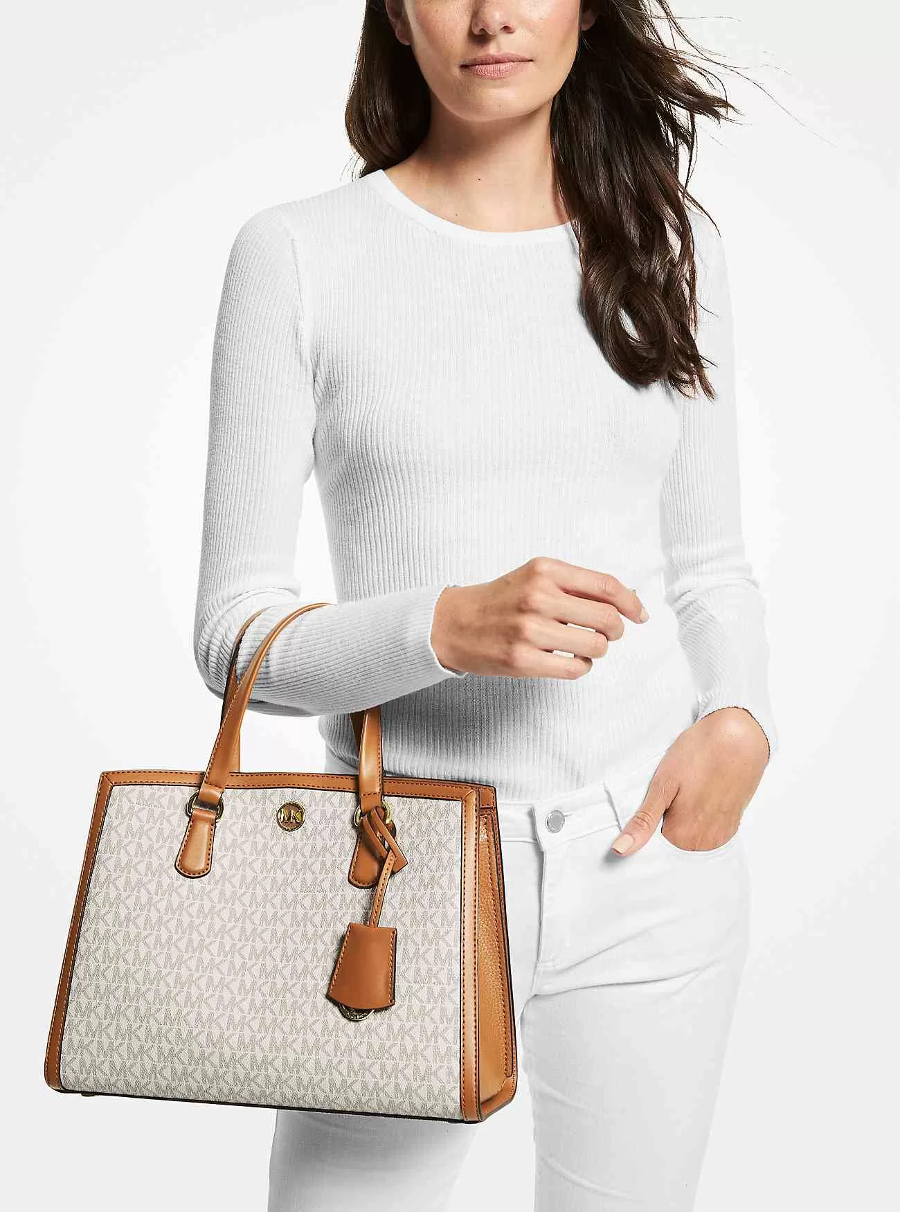 Gli interni spaziosi e la silhouette senza tempo rendono la nostra borsa Chantal un compagno ideale per tutti i giorni. L’hardware del logo e gli accenti a maglia di catena conferiscono a questa borsa in tela con stampa Signature un tocco glamour, mentre una tracolla staccabile mantiene le mani libere e gli effetti personali a portata di mano. Pensiamo che sia il borsone perfetto per i giorni di viaggio e altro ancora.
