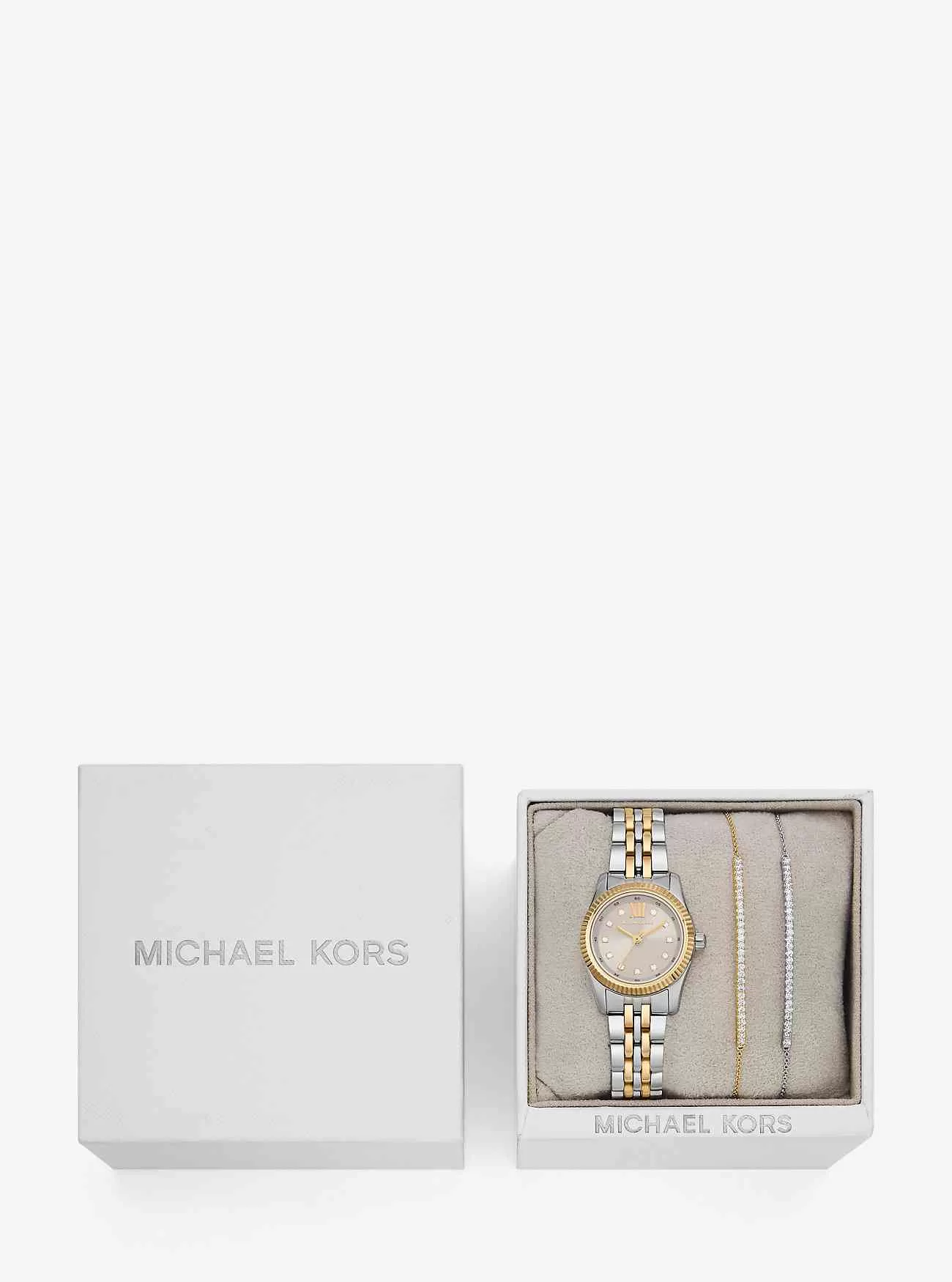 Regala un tocco di eleganza con questo set di orologi 3 in 1. Un quadrante elegante con accenti in pavé e un cinturino a bracciale smussato conferiscono a questo intramontabile segnatempo in acciaio inossidabile bicolore una finitura lucida, mentre i bracciali scorrevoli abbinati aggiungono un effetto accattivante. Tutti e tre sono ben confezionati insieme in una scatola, rendendolo un facile regalo dell’ultimo minuto.