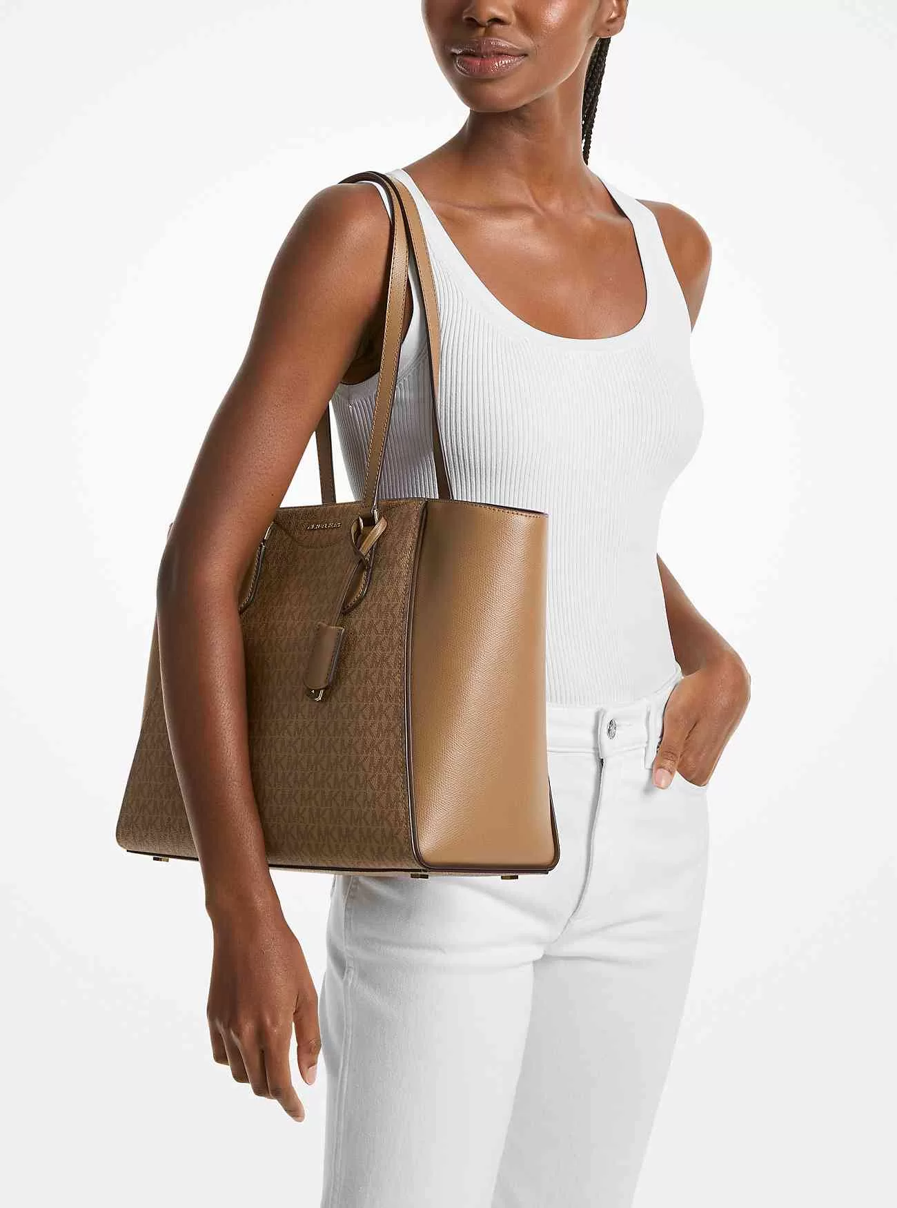 La borsa Taryn è un capo elegante per i giorni feriali, i fine settimana e ogni momento intermedio. Realizzata nella nostra tela con stampa del logo Signature con finiture in pelle, questa borsa strutturata presenta cuciture a trapezio e un ciondolo con lucchetto staccabile. Si apre per rivelare un interno spazioso, completo di tasche laterali e uno scomparto centrale per il tuo tablet o oggetti di valore.