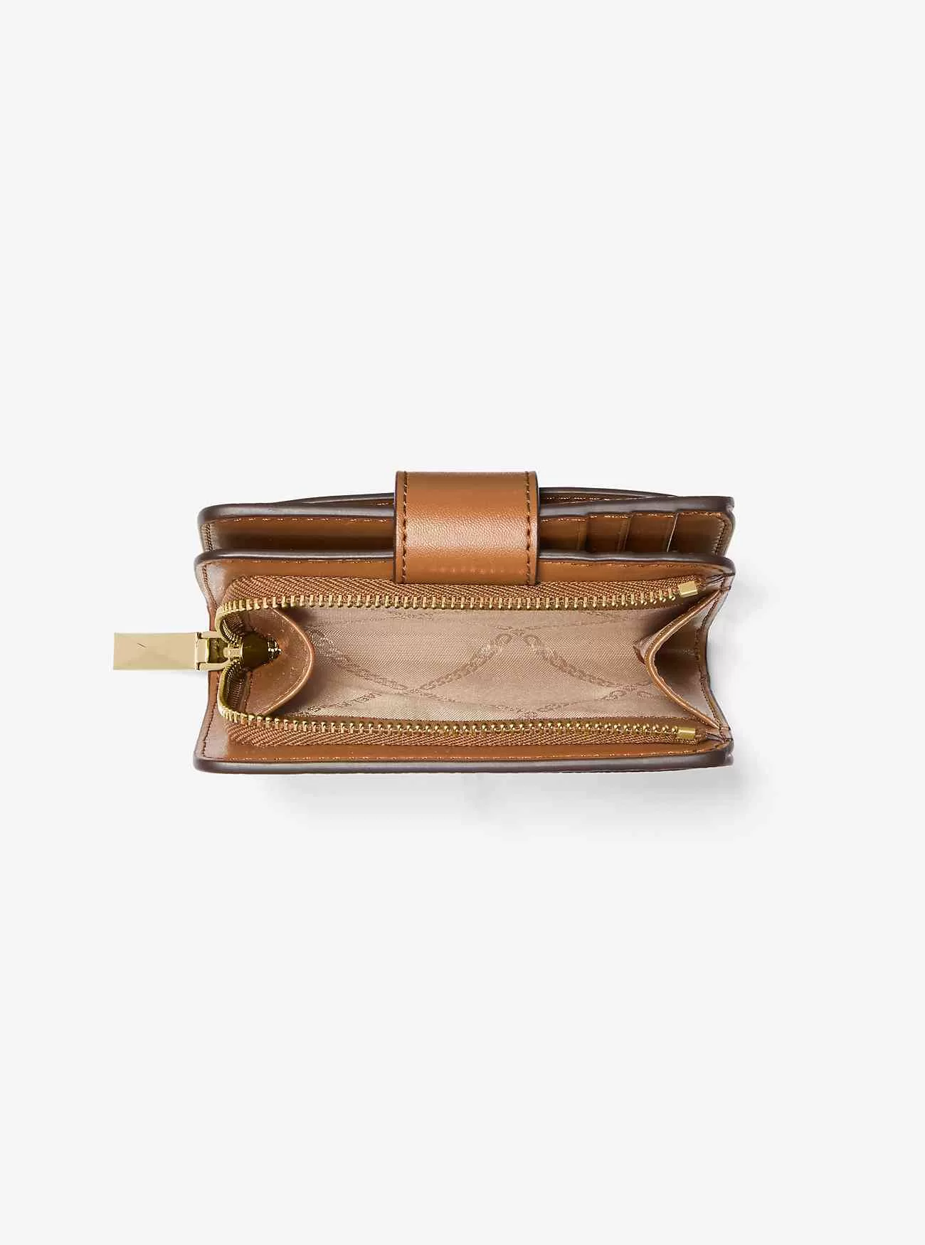 Questo piccolo portafoglio è grande in termini di stile e spazio di archiviazione, grazie a un design ultracompatto. Si apre per rivelare una serie di scomparti per carte e uno scomparto per monete con cerniera. È rifinito con una chiusura a scatto completa di ciondolo con logo color oro. Conserva la tua carta d’identità o di trasporto nella tasca esterna a bustina per un facile accesso.