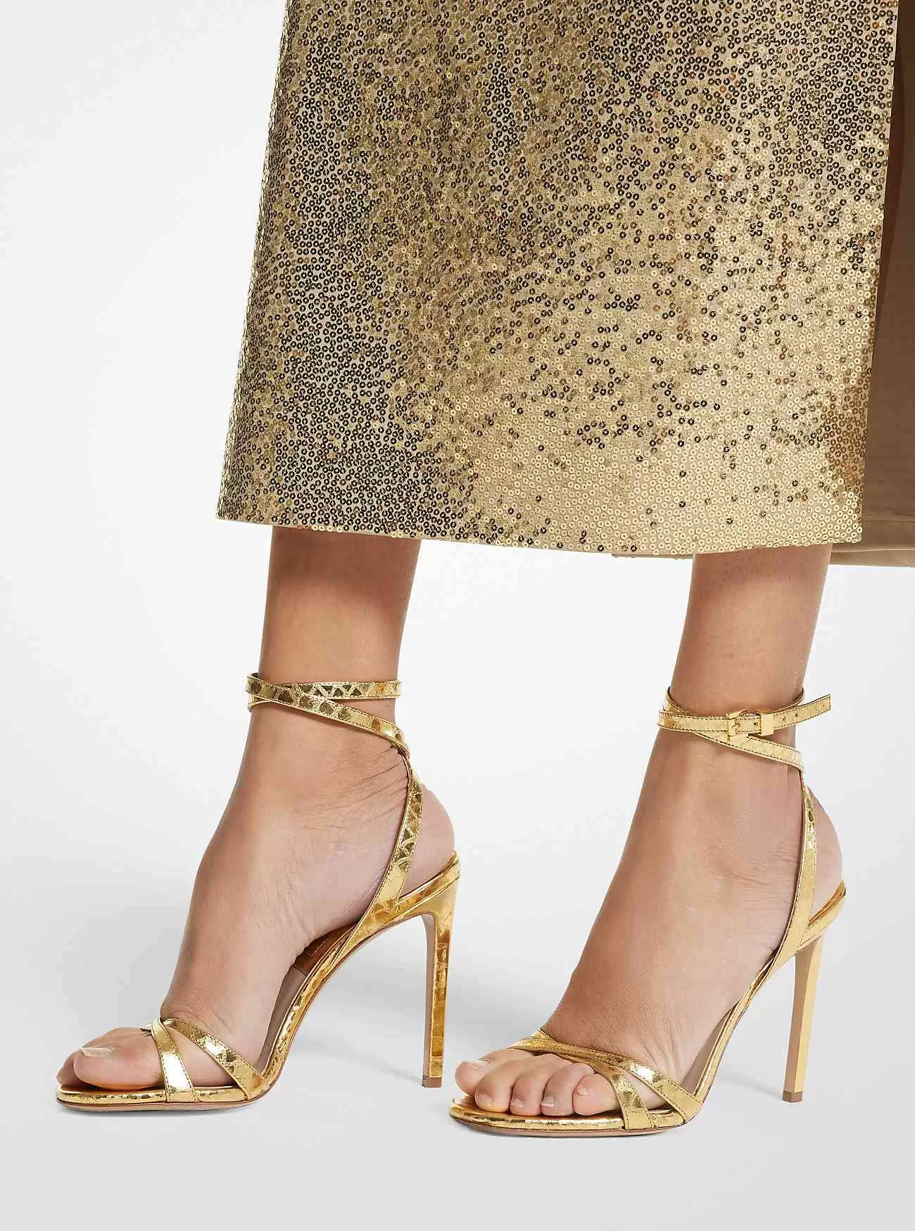 Abbinati alle gonne pareo della passerella Primavera/Estate 2023, i sandali Chrissy sono realizzati in Italia in pelle metallizzata con stampa pitone. Sono caratterizzati da sottili cinturini incrociati sulla punta e sulla caviglia e poggiano su un tacco a spillo che allunga la gamba. Con una silhouette sofisticata ma seducente, diventeranno presto le tue scarpe da sera preferite.