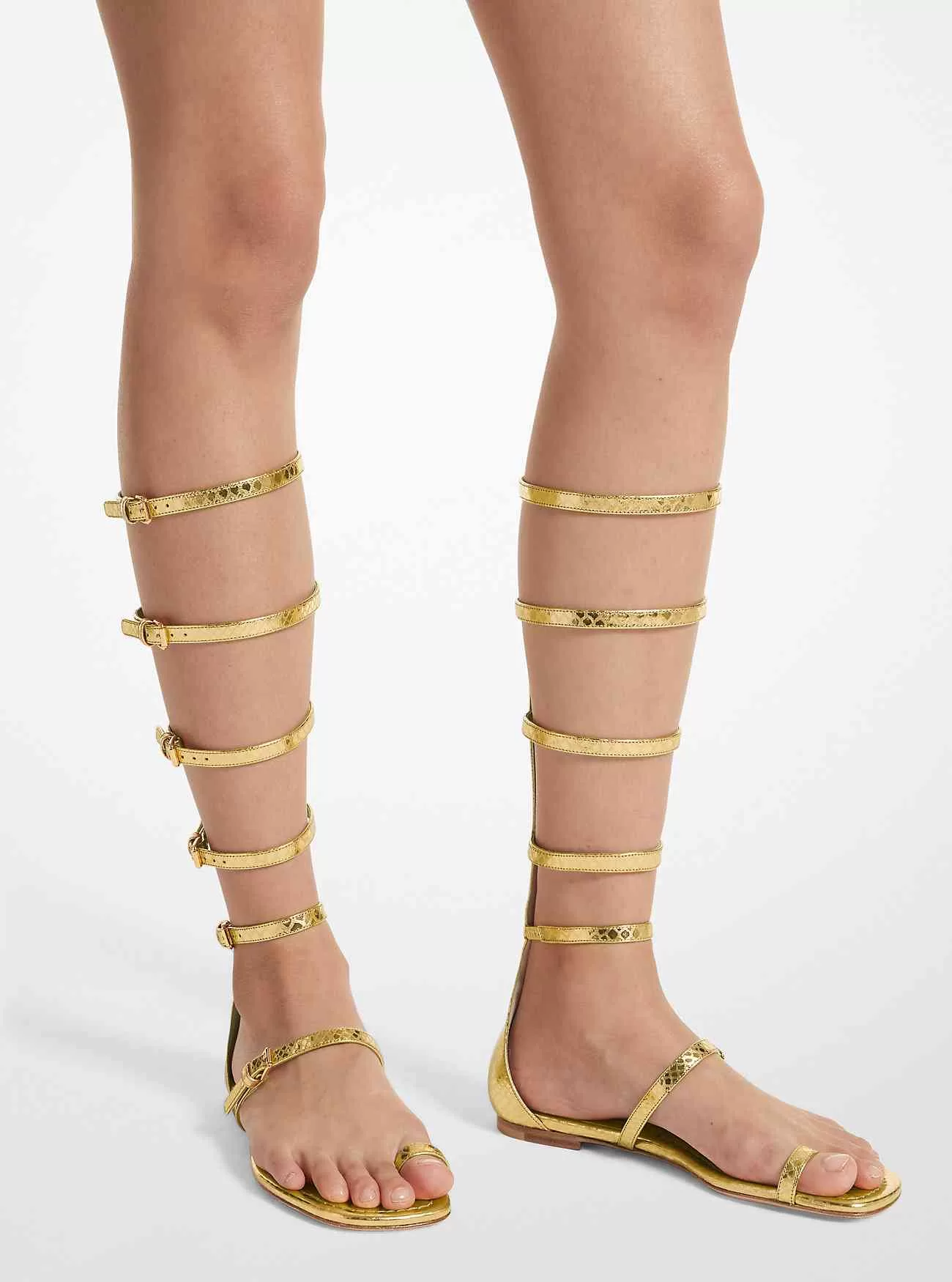 I nostri sandali Juliette realizzati in Italia conferiranno un tocco bohémien alla moda a qualsiasi completo. Caratterizzato da silhouette lunghe sulla passerella Primavera/Estate 2024, questo paio in pelle metallizzata con stampa pitone presenta spalline sottili che valorizzano le gambe e delicate fibbie color oro per una finitura lucida. Bilancia il design a metà polpaccio con l’intrigante vestito a canotta da baby-doll della stagione.