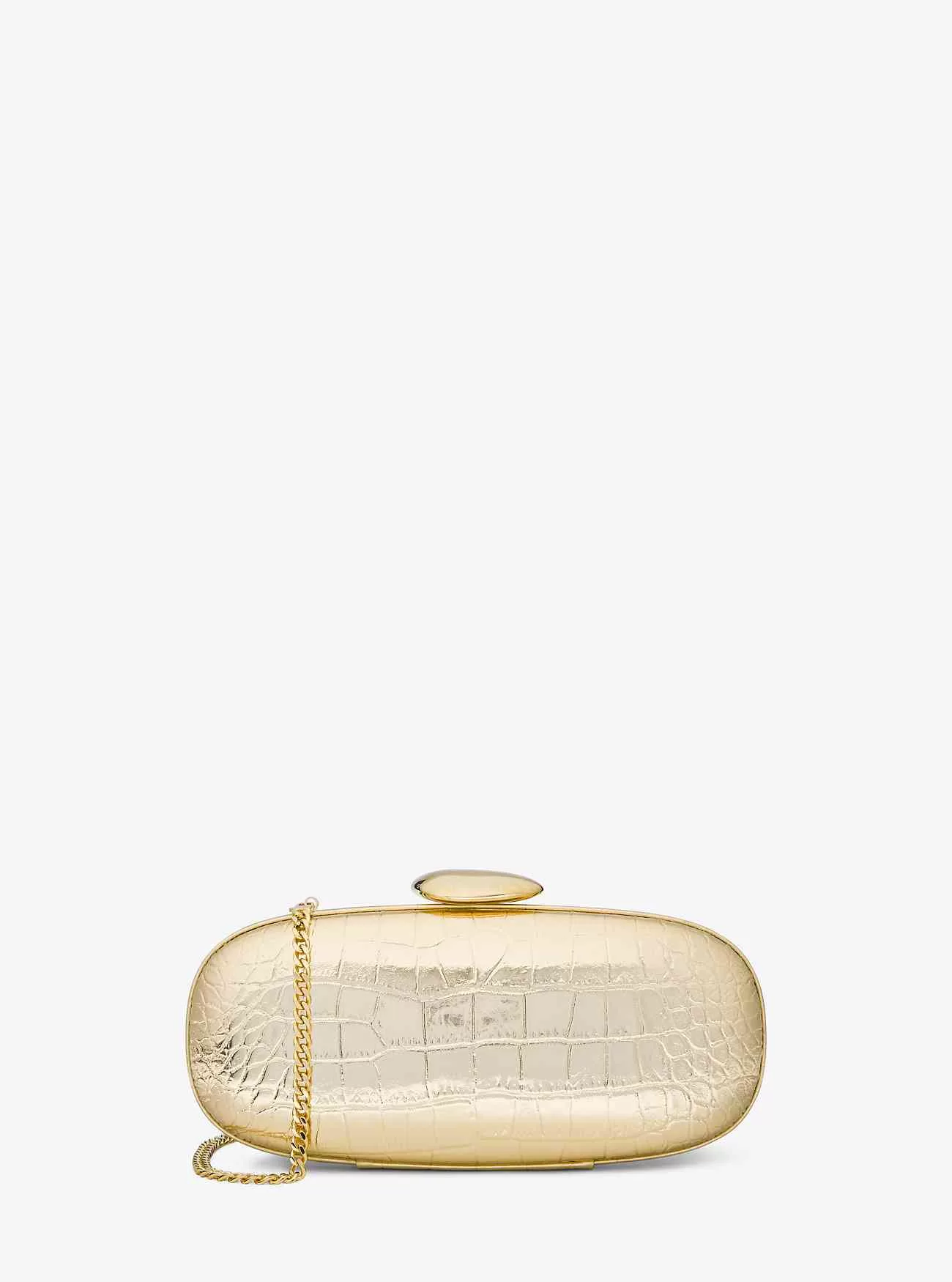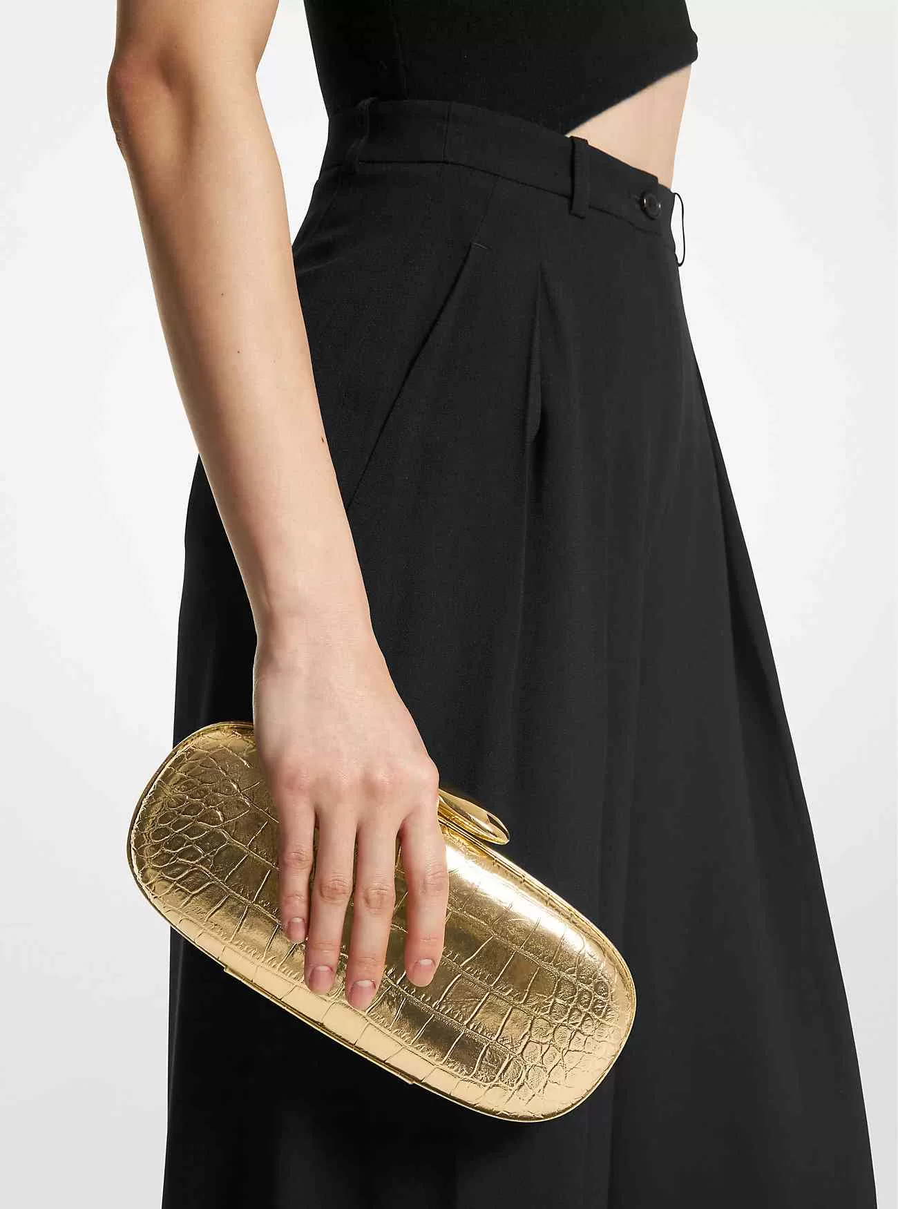 Caratterizzato da un’elegante chiusura superiore a forma di pietra, il nostro moderno Tina minaudie re è definito da linee eleganti e da una tracolla a catena rimovibile. Realizzato in pelle goffrata di coccodrillo di produzione italiana con finitura metallica e dotato di un ricco interno foderato in pelle scamosciata, si abbina perfettamente sia ad abiti ariosi che ad abiti su misura.
